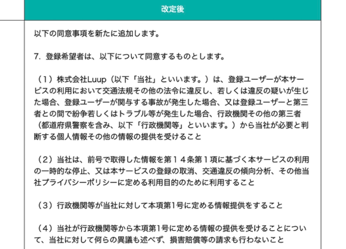 しかも、これまでは警察が利用者の同意を得られた場合に限って情報を Luup 側に提供していたが、これからはアプリ上で事前に同意していた利用者だけがサービルを利用できる仕組みになるとのこと。